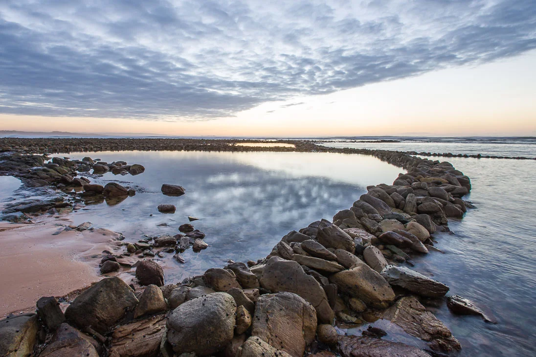 The inclusion of the estuary in the Stilbaai MPA makes it a leading example of integrated coastal management. The Goukou Estuary is a nutrient rich environment of mud flats and salt marshes and is home to a wide range of invertebrates. The estuary is also an important nursery for many species of commercially important marine fish. Birders enjoy visits to this area as it supports a wide range of wading birds, many of which occur in large flocks. The MPA has cultural significance as it contains some of South Africa’s best-preserved examples of fish traps or “visvywers”. The ancient intertidal stonewall pools were created to trap fish at low spring tide. Some may have been built over 3 000 years ago, but many are much younger. This means that people in the area have been collecting seafood for a very long time. The terrestrial Skulpiesbaai Nature Reserve lying to the west of the small fishing harbour is excellent for watching seabirds and for exploring the intertidal rock pools. The MPA is managed by Cape Nature and has onshore and offshore no-take and controlled zones.
